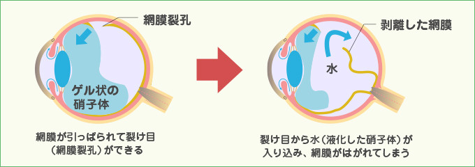 網膜色素上皮細胞と神経網膜の接着は弱いので、何らかの原因で神経網膜が網膜色素上皮細胞からはがれて、硝子体の中に浮き上がってしまうことがあります。