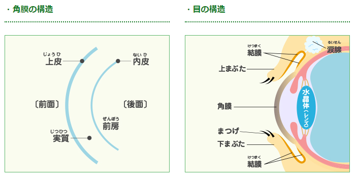 角膜の表面にある上皮は涙におおわれて、細胞分裂を綴り返しながら速い周期で入れかわっており、外界の刺激や病原体の侵入に対する一種のバリアを形成しています。実質組織は角膜の骨組みで、主としてコラーゲンとムコ多糖類より出来ています。角膜の裏側にある内皮は一層の細胞シートで、ポンプ技能により角膜内の水分をいつも適量に調節しており、角膜を透明に保っています。